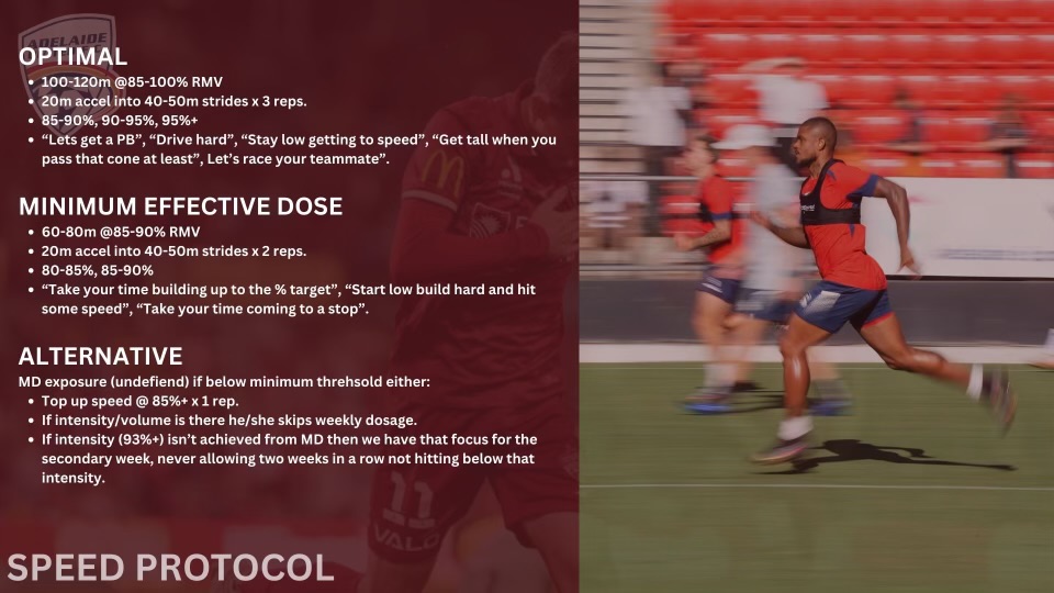 The framework also outlines simple sprint exposure options depending on the schedule. In short turnaround weeks, the target may be a minimum effective dose of 60–80 metres at roughly 85–93% MSS. In more normal weeks, that can build to 80–120 metres above 85% MSS through progressively faster strides. It is a practical way to keep speed in the program without creating unnecessary fatigue.